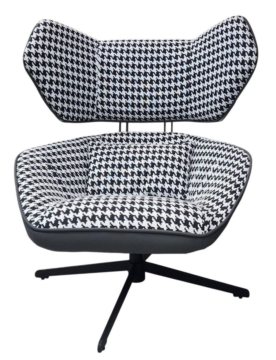 This modern leisure chair features a striking black and white houndstooth fabric with PU accents and high-density foam for comfort. Supported by a sturdy metal swivel base, it offers both style and functionality for any contemporary space. TYPE - leisure chair MATERIAL - fabric+PU+High quality foam+metal leg COLOUR - white & black
