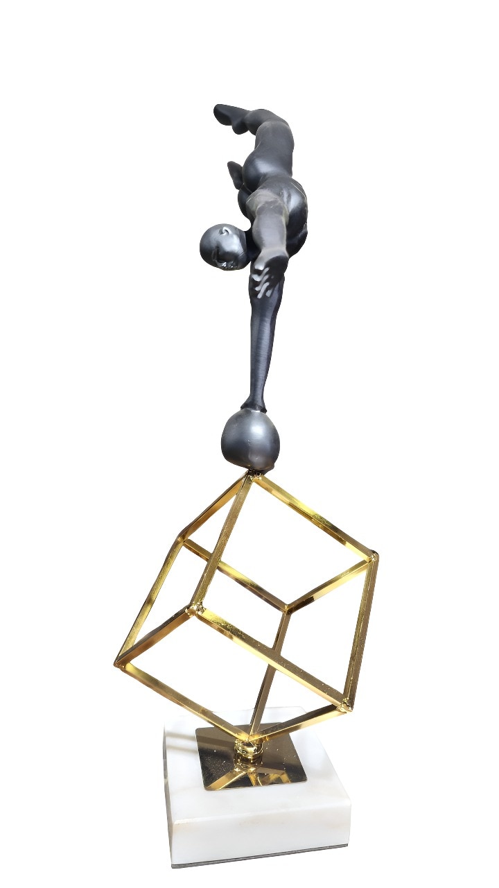 DESCRIPTION - Nordic gymnastics character statue marbled Plating metal resin sculpture. MATERIAL - Resin+metal+marble Dimension - 15*15*48 COLOUR - Black, gold & white